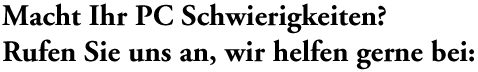 - Computerprobleme jeglicher Art. Wir kommen zu Ihnen oder Sie kommen zu uns. - Verkauf von Marken PC's oder individuell nach Kundenwunsch assemblierte PC's für höchste Ansprüche. - PC Umbauten, Reparaturen, Aufrüstungen mit Garantie. - Internet, E-Mail Installationen. - Vernetzungen im Heim- und Officebereich. - Konfiguration NT-Server, Router. - Netzwerkprojektierung, Umsetzung und Wartung. - Schulung Referenzen: UNI - ZH, UBS, Anwaltskanzlei Pugatsch, Bauunternehmung Mauerer & Hösli, Befina Treuhand sowie zahlreiche zufriedene Privatkunden. Dienstleistungspreis: Fr. 140.- inkl. Mwst (ausgenommen Netzwerk Installationen) Wegpauschalen: Fr. 90.- Stadt Zürich. |